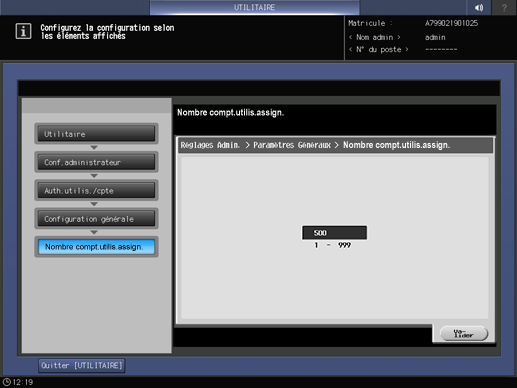 Nombre compt.utilis.assign. | Entrez le nombre d'Authentifications utilisateur pour distribuer un total de 1000 entrées d'authentification. Le nombre d'entrées qui restent après le nombre introduit constitueront les entres Suivi comptes. | |
