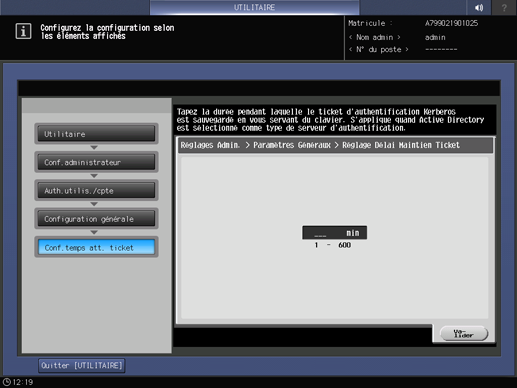 Appuyez sur Réglage durée ticket et entrez la période de temps.