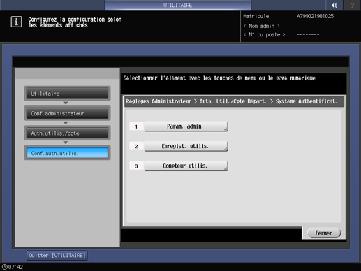 2. Appuyez sur Auth.utilis./cpte sur l'écran Menu config. administrateur. Appuyez successivement sur Conf.auth.utilis. et Config. administr.