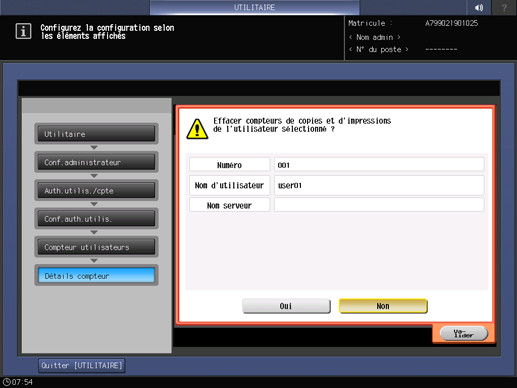 • Explication supplémentaireSélectionnez le nom d'utilisateur du compteur à initialiser et appuyez sur Détails compteur. Appuyez sur Public (illustration page 26) pour réinitialiser le compteur d'utilisateurs publics et appuyez sur Détails compteur. Les écrans Détails compteur s'affichent respectivement.