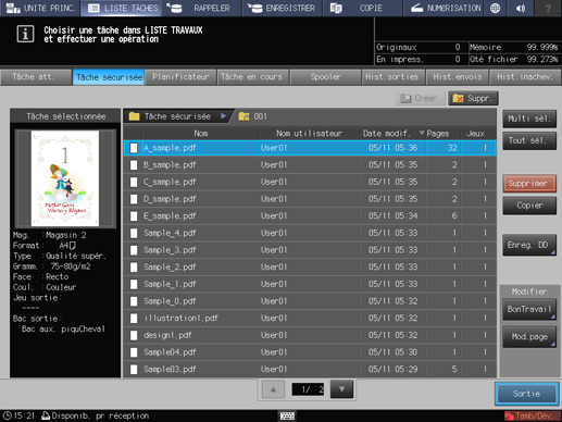 Pour en savoir plus sur les fonctions de modification des tâches sur l'écran LISTE TÂCHES, comme Enregistrer sur HDD, voir Ecran [Tâche sécurisée].