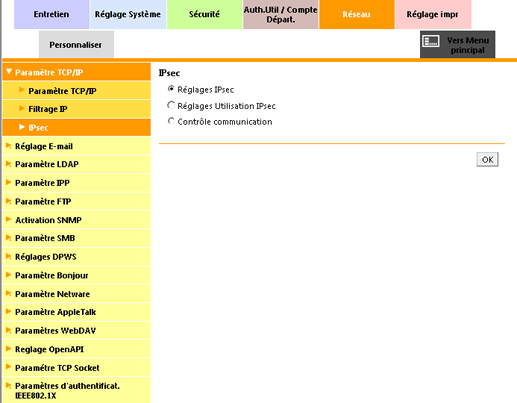 Pour afficher cet écran, cliquez sur Paramètre TCP/IP - IPsec dans le menu de l'onglet Réseau.