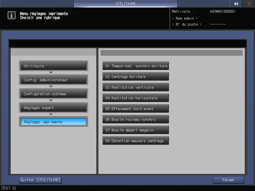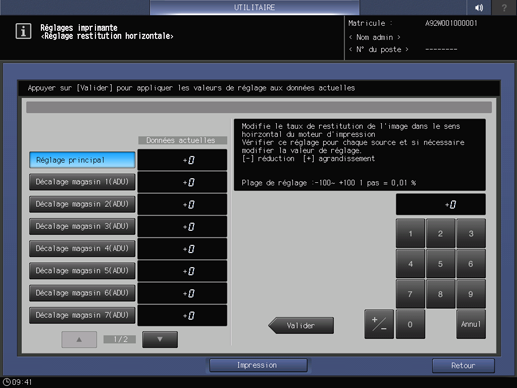 Cette opération est la même que celle effectuée dans Réglage - Réglage machine - Réglages imprimante - Restitution horizontale, accessible sur l'écran UNITÉ PRINC.