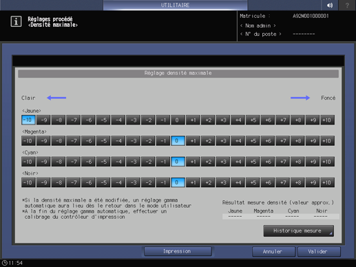Appuyez sur Configuration système dans le menu Réglage administrateur et appuyez consécutivement sur Réglages expert, Réglages procédé et Réglage densité maximale.