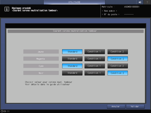 Appuyez sur Configuration système sur l'écran Menu Config. administrateur. Appuyez successivement sur Réglages expert, Réglages procédé et Corona neutralisation tambour.