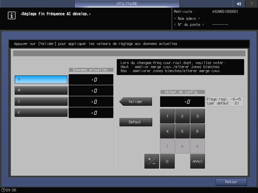 Appuyez sur Configuration système sur l'écran Menu config. administrateur. Appuyez successivement sur Réglages expert, Réglages procédé et Régl.fin fréq.cour.roul.dvpt.