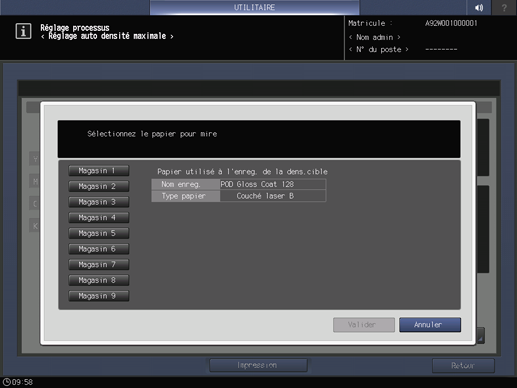 Assurez-vous d'utiliser le papier enregistré pour la densité souhaitée pour effectuer le réglage automatique de la densité maximale. Si le papier n'est pas enregistré, le réglage ne peut pas être effectué correctement.
