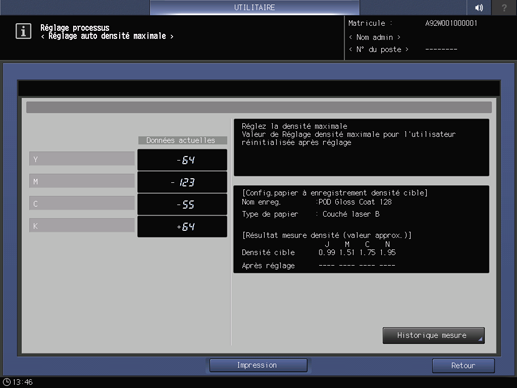 Le résultat du réglage automatique est affiché sous Données actuelles. Ces valeurs se reflètent sur [Réglage densité maximale].