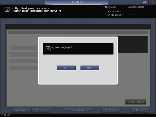 Une mire de test est imprimée et l'écran retourne automatiquement sur Régl.décal.gamma impr.auto.