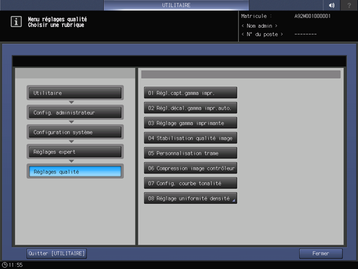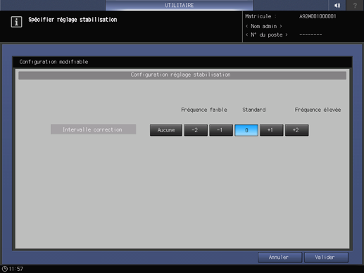 Appuyez sur Configuration système dans le menu Réglage administrateur et appuyez consécutivement sur Réglages expert, Réglage qualité et Stabilisation qualité image.