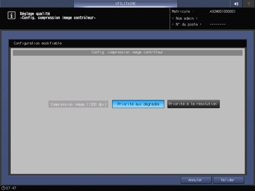 Appuyez sur l'onglet Configuration système de l'écran Menu Réglage administrateur et appuyez successivement sur Réglages expert, Réglage qualité et Compression image contrôleur.