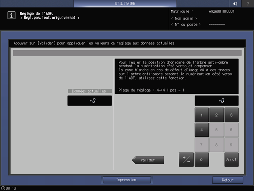 Appuyez sur l'onglet Configuration système de l'écran Menu fonctions administrateur et appuyez successivement sur Réglages expert, Réglage chargeur d'originaux et Régl.pos.lect.orig.(verso).