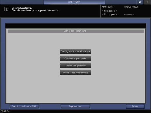Appuyez sur l'onglet Configuration système de l'écran Menu Réglage administrateur et appuyez sur Liste des compteurs.