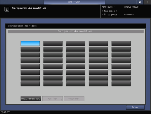 Sélectionnez une touche vierge de l'écran Paramétrage des annotations et appuyez sur Nouv. enregistr. pour enregistrer un nouveau réglage d'annotation.