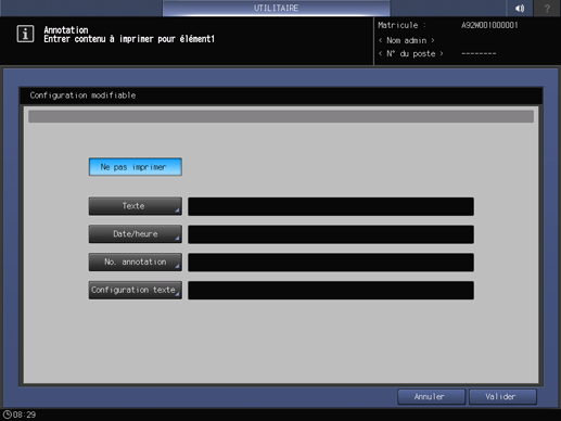 Sélectionnez un des éléments Texte, Date/heure et N° annotation et définissez le contenu à imprimer.