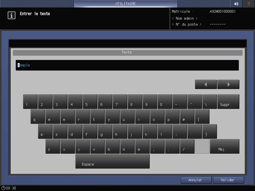 Explication supplémentairePour afficher l'écran Entrée de texte, sélectionnez Texte. Entrez le texte d'annotation à imprimer et appuyez sur Valider. Pour en savoir plus sur la saisie des caractères, voir Saisie des caractères.