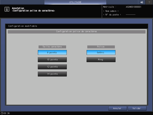 Explication supplémentaireAppuyez sur Paramétrage texte pour afficher l'écran Sélection police de caractères. Sélectionnez une des options Taille caractères et une des options Police, puis appuyez sur Valider.