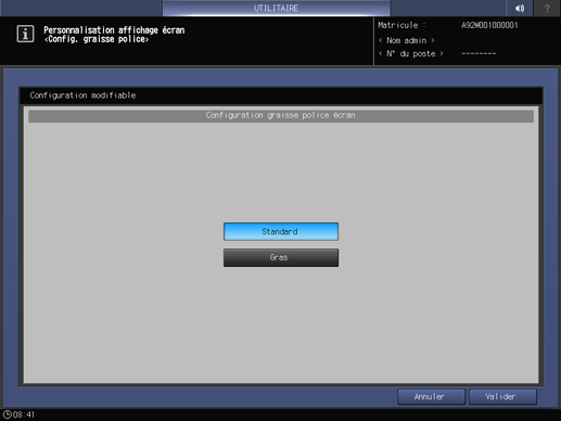 Appuyez sur l'onglet Configuration système sur l'écran Menu Réglage administrateur et appuyez consécutivement sur Personnalisation écran et Choix graisse police écran.
