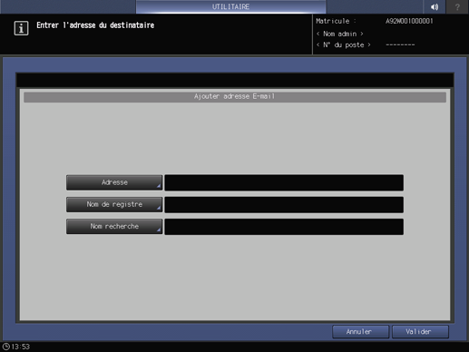 Suivez la procédure sur Enregistrement d'une destination, d'un titre et d'un message d'e-mail pour afficher l'écran Menu Enregistrement adresse.
