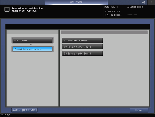 Suivez la procédure sur Enregistrement d'une destination, d'un titre et d'un message d'e-mail pour afficher l'écran Menu Enregistrement adresse.