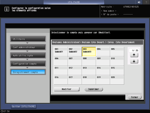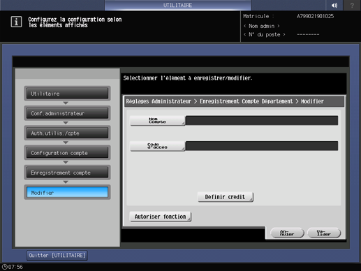 Appuyez sur l'onglet Auth.utilis./cpte de l'écran Menu fonctions administrateur, puis appuyez consécutivement sur Configuration compte et Enregistrement Compte Département.
