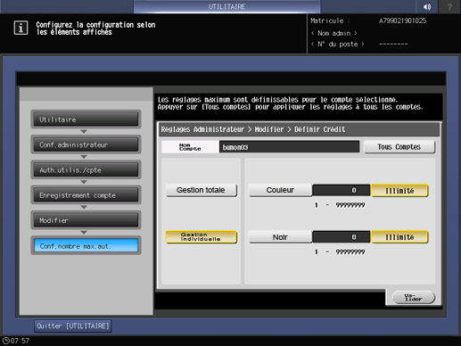 Utilisez cette fonction pour affecter un numéro à chaque compte et définissez les champs Nom de compte, Mot de passe, Définir limite max. et Autorisation fonctions pour chaque numéro de compte.