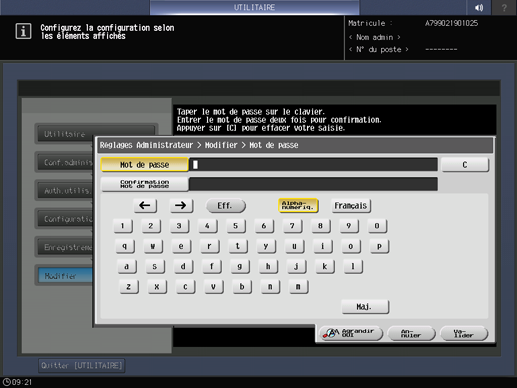 Explication supplémentaireAppuyez sur Mot de passe pour afficher l'écran Mot de passe. Entrez un mot de passe de votre choix. Appuyez sur Confirmation du code, retapez le même mot de passe et appuyez sur Valider. Vous pouvez entrer un maximum de 8 caractères à un octet pour le mot de passe.