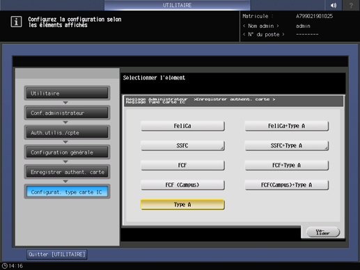 Appuyez sur Authentification par carte et Configurat. type carte IC. Sélectionnez la carte IC à utiliser.