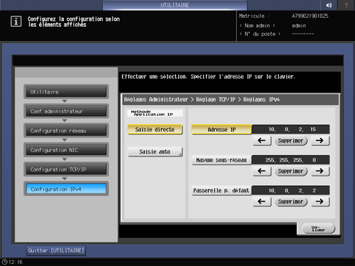 Appuyez sur Configuration réseau sur l'écran Menu Configuration administrateur et appuyez sur Configuration NIC.