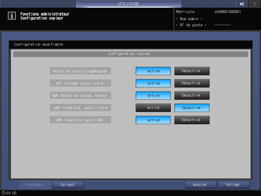 ADF Sélection autom. format | Spécifiez s'il faut activer ou non PapierAuto quand un original est placé dans le chargeur Auto. | Activé, Désactivé |