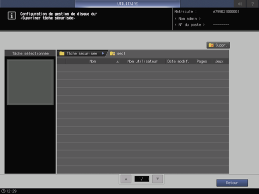 2. Appuyez sur l'onglet Configuration sécurité de l'écran Menu Config. administrateur et appuyez consécutivement sur Configu.gest. de disque dur et Supprimer tâche sécurisée.