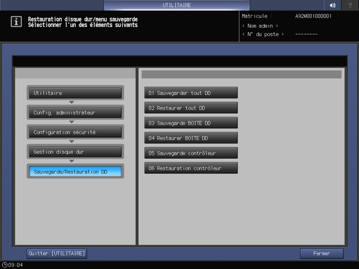 Appuyez sur l'onglet Configuration sécurité de l'écran Menu Réglage administrateur et appuyez consécutivement sur Gestion disque dur et Sauvegarde/Restauration DD.