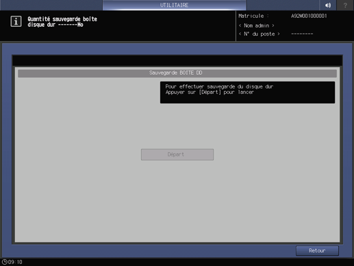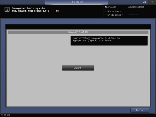 Explication supplémentairePour lancer la sauvegarde des données de réglage stockées sur le contrôleur d'image IC-604, appuyez sur Départ à l'écran.