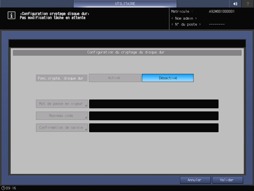 • Le réglage de cryptage du disque dur ne peut être modifié que lorsque qu'aucune tâche (tâche en attente, tâches DD, tâches sécurisées) n'est enregistrée sur le disque dur.