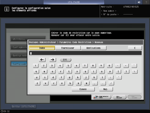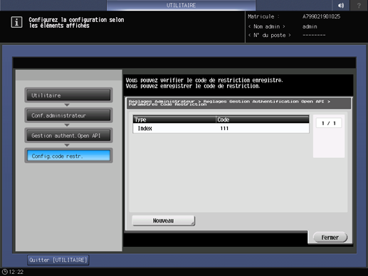 Appuyez sur Gestion authent.Open API sur l'écran Menu Config. administrateur et appuyez sur Paramètres Code Restriction.