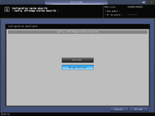 En sélectionnant Afficher, vous affichez l'écran d'avertissement de configuration de sécurité lorsque la machine répond aux conditions suivantes :