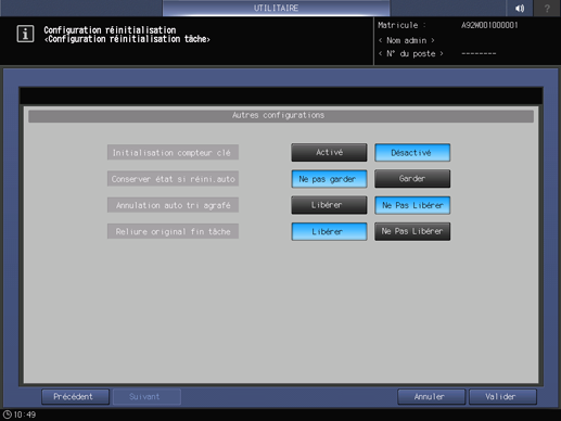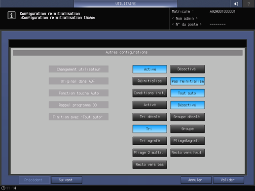 Changement d'utilisateur | Spécifiez si vous souhaitez initialiser les conditions de tâche lorsque la machine détecte un changement d'utilisateur. L'exécution d'une des opérations suivantes signifie pour la machine un changement d'utilisateur : - Retrait du compteur clé ou de la carte de copie - La sélection de la touche Accès du panneau de contrôle après une authentification utilisateur/compte réussie | Activé, Désactivé |