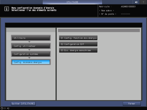Appuyez consécutivement sur Configuration système sur l'écran Menu Configuration utilisateur et appuyez sur Réglage économie énergie et Eco énergie monochrome.