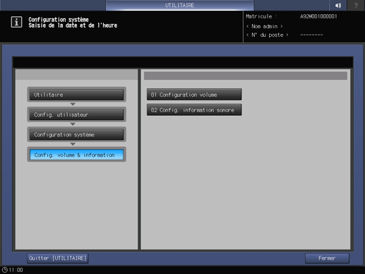 Appuyez consécutivement sur Configuration système sur l'écran Menu Réglage utilisateur et appuyez sur Réglage volume & information et Sélection information sonore.