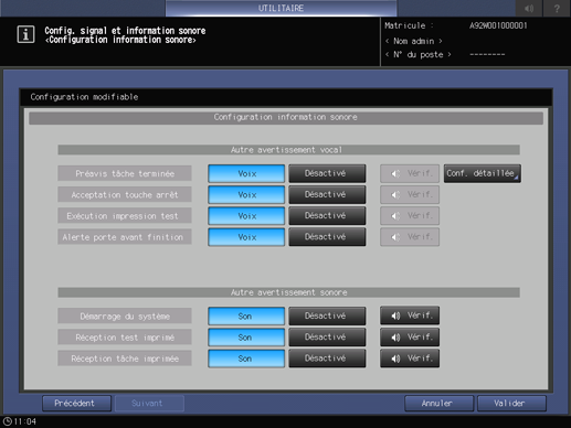 Spécifiez le nombre de répétitions du son ou de la voix qui retentit quand une tâche s'arrête par manque de papier ou suite à un bourrage ; spécifiez également le son individuellement pour des éléments donnés.