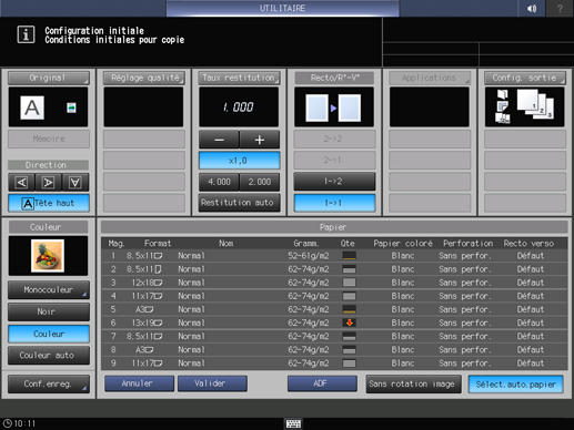 Appuyez sur l'onglet Configuration initiale de l'écran Menu Réglage utilisateuret appuyez sur Mode copie.