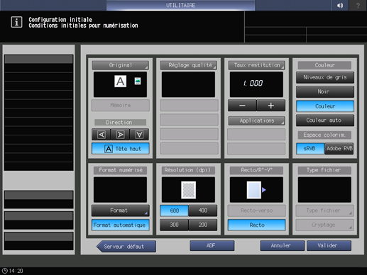 Définissez les réglages par défaut de l'écran des réglages de numérisation.