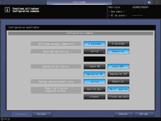 Impression en continu | Spécifiez s'il faut ou non produire plusieurs tâches en réserve les unes à la suite des autres sans arrêter la machine pour une pause. | Copie ON, Copie OFF, Impression ON, Impression OFF |