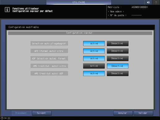 ADF Sélection autom. format | Spécifiez s'il faut activer ou non PapierAuto quand un original est placé dans le chargeur Auto. | Activé, Désactivé |