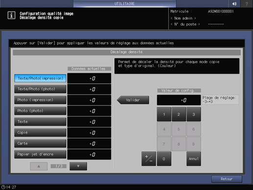 Réglez le degré de Décalage densité dans chaque mode de qualité pour En couleurs, Noir et Monocouleur respectivement.