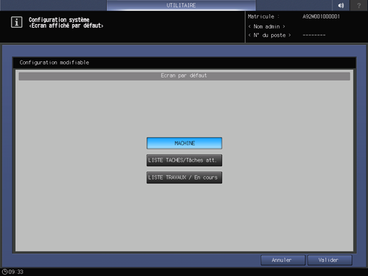Appuyez sur l'onglet Configuration système de l'écran Menu Réglage utilisateuret appuyez sur Ecran par défaut.