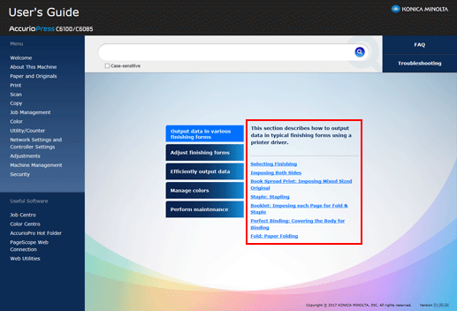 Vous pouvez rechercher des informations relatives au traitement de cette machine, par exemple sur l'impression et les fonctions d'application, les réglages et la méthode d'entretien.