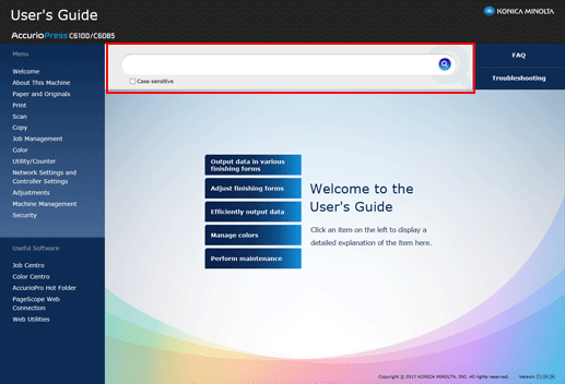 Ce champ de recherche en haut du manuel peut être utilisé pour rechercher les informations nécessaires dans le Guide de l'utilisateur. Saisissez un mot-clé dans le champ de saisie et cliquez sur