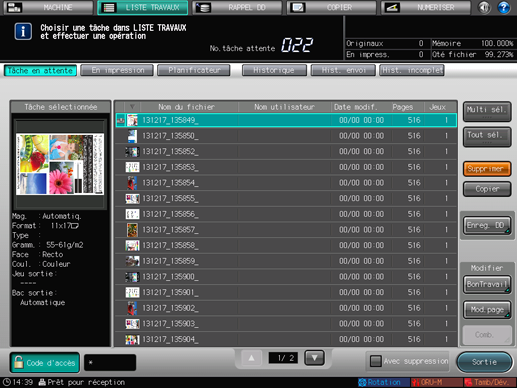 Pour en savoir plus sur les fonctions de modification des tâches de l'écran [LISTE TRAVAUX], comme l'enregistrement sur le disque dur, voir Modifier une tâche en attente.
