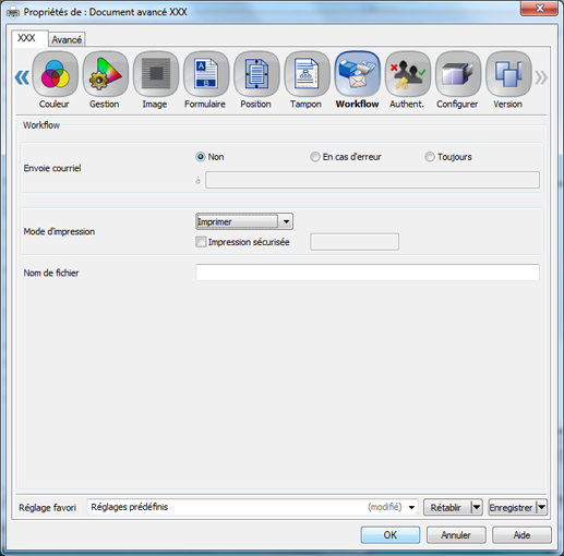 [Envoie courriel] | [Non], [En cas d'erreur], [Toujours] | Pour envoyer un e-mail en fin de tâche d'impression à une adresse spécifiée, configurez ce réglage. |